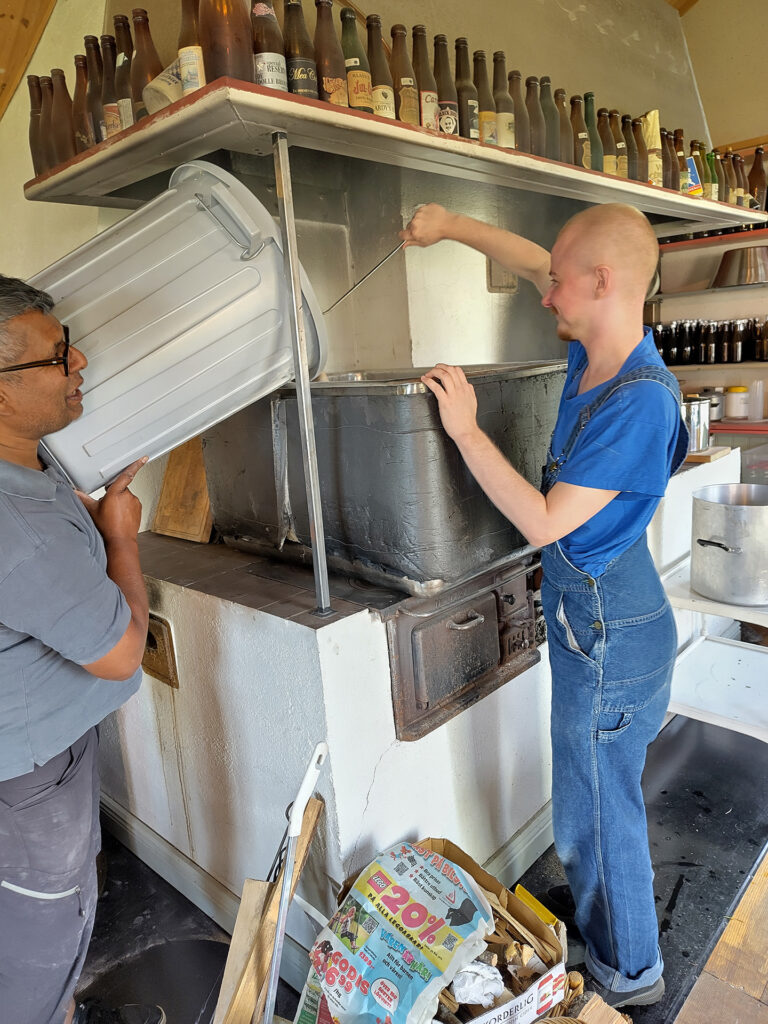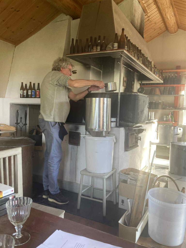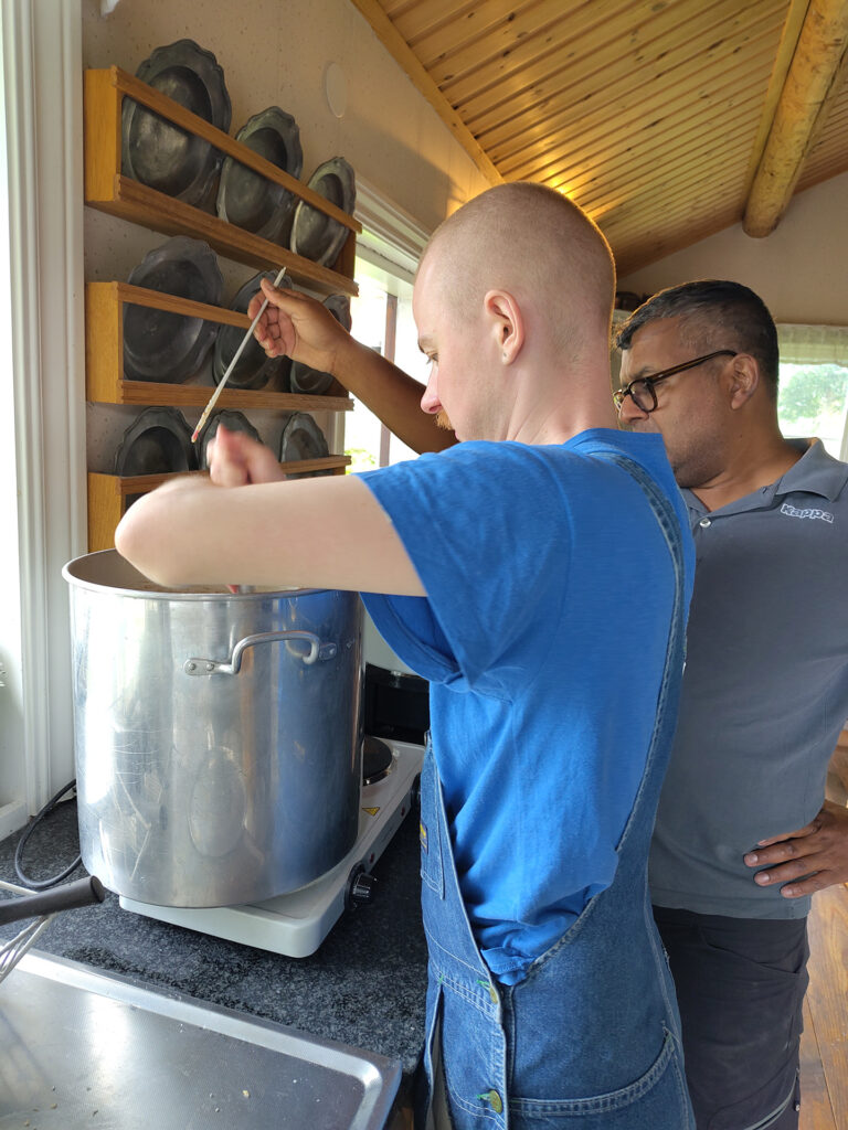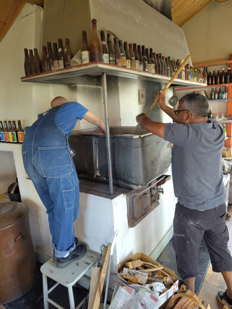 Det första steget i bryggningen är mäskning där en förmäsk av vetemjöl ingår. På bilderna ser man hur Leo övervakar gelatiniseringen vid 63 grader i en separat kastrull på elplatta. Huvudmäsken mäskas in i det stora vedeldade bryggverket, på bild ser vi Peter tippa i den krossade kornmalten. Efter proteinrasten tippas förmäsken i av Leo. Mäsken är rejält styv och vi turas om med mäskrodret, på bild Georg. Sockerrast och destrinrast kräver fullt fokus när man har ett vedeldat bryggverk, på bild Leo och Peter i mättagen. Vi mäskar ut vid 78 grader och sedan är det dags för lakning. Lakningen tar tid men med tre lakstationer och mycket hett vatten får vi vår önskade vörtstyrka. Georg öser på bild. Dag två ägnades vörtkok och kylning och den tredje dagen sattes jäsningen igång.