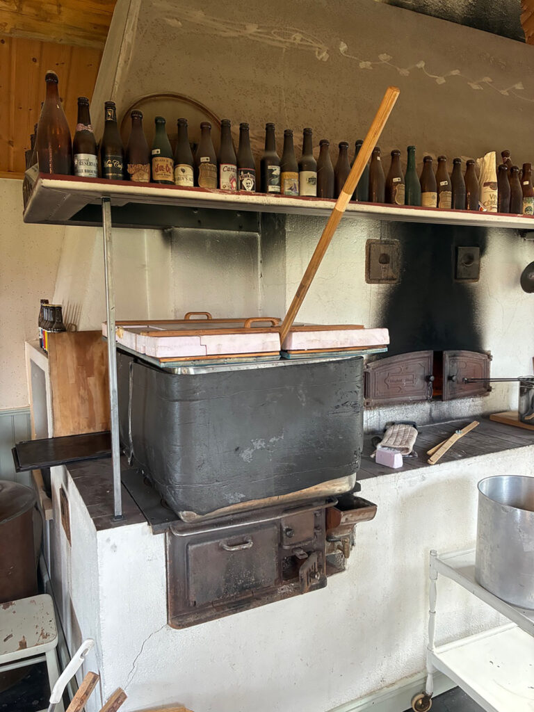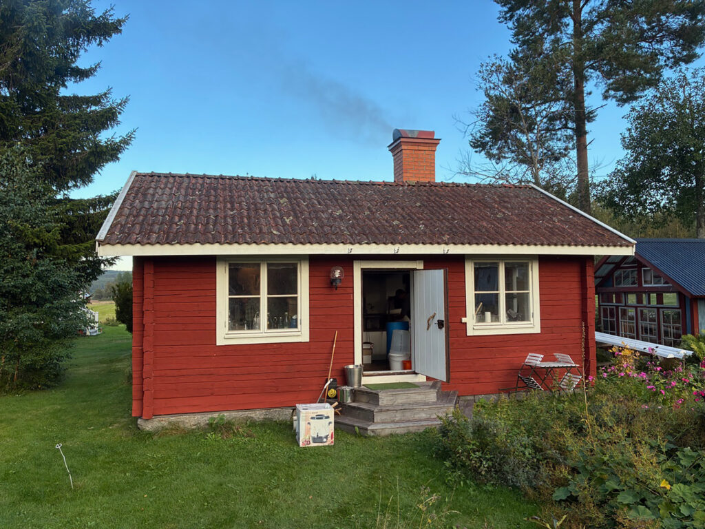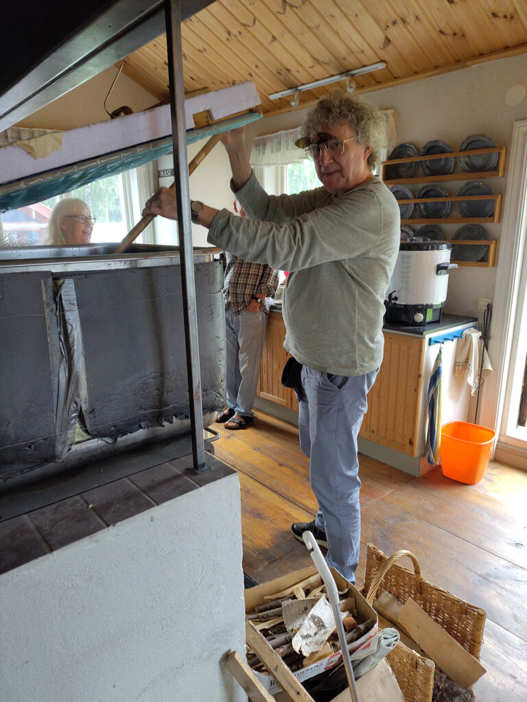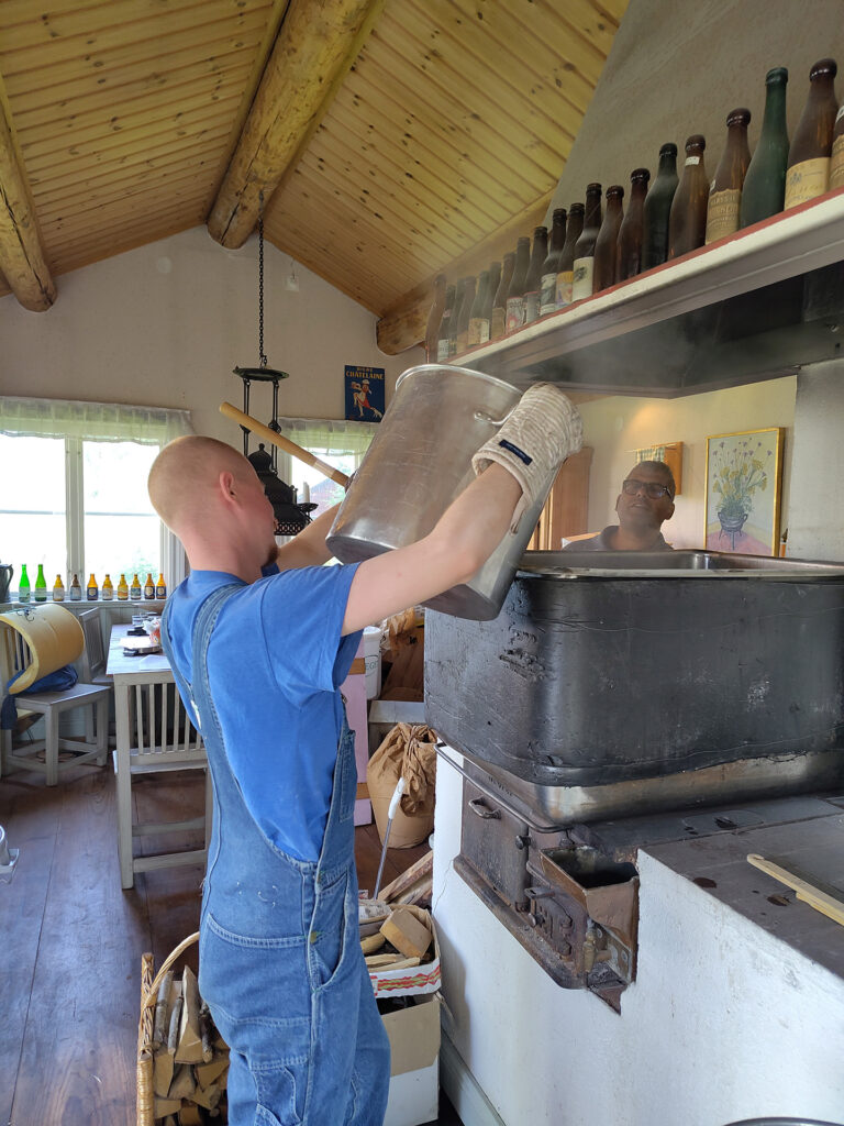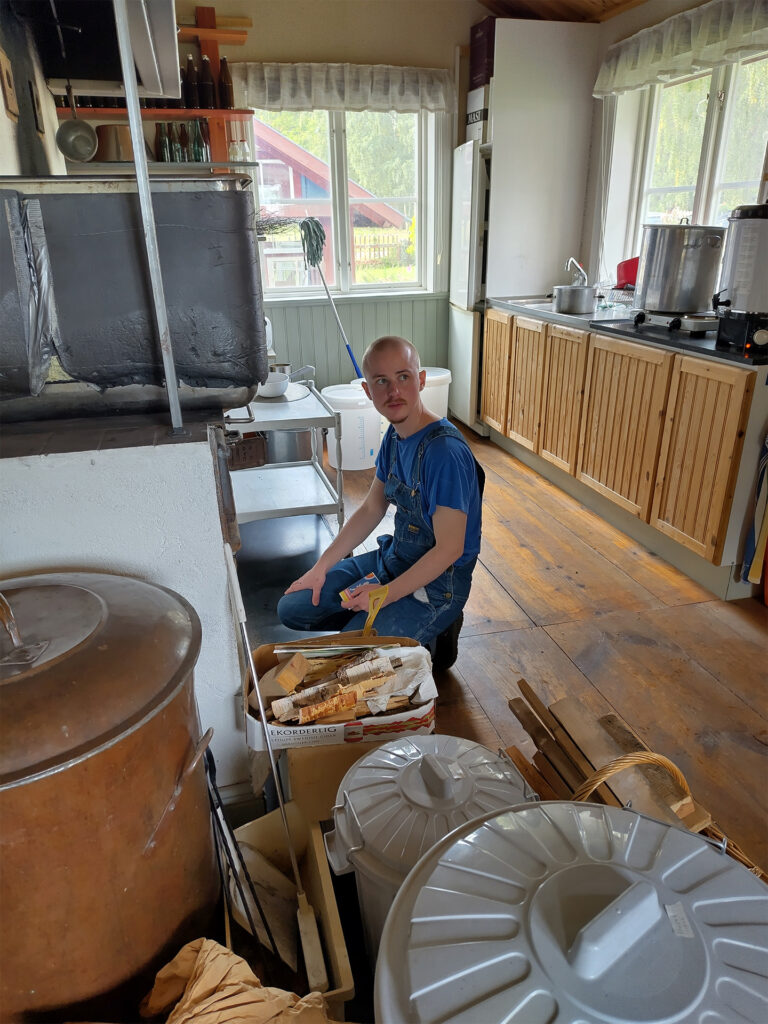 Det första steget i bryggningen är mäskning där en förmäsk av vetemjöl ingår. På bilderna ser man hur Leo övervakar gelatiniseringen vid 63 grader i en separat kastrull på elplatta. Huvudmäsken mäskas in i det stora vedeldade bryggverket, på bild ser vi Peter tippa i den krossade kornmalten. Efter proteinrasten tippas förmäsken i av Leo. Mäsken är rejält styv och vi turas om med mäskrodret, på bild Georg. Sockerrast och destrinrast kräver fullt fokus när man har ett vedeldat bryggverk, på bild Leo och Peter i mättagen. Vi mäskar ut vid 78 grader och sedan är det dags för lakning. Lakningen tar tid men med tre lakstationer och mycket hett vatten får vi vår önskade vörtstyrka. Georg öser på bild. Dag två ägnades vörtkok och kylning och den tredje dagen sattes jäsningen igång.
